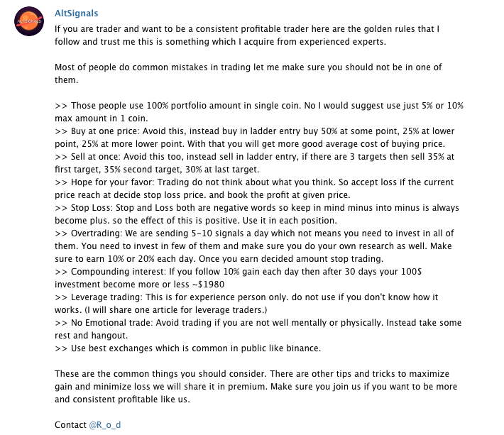 Altsignals Trade Calls Telegram is dedicated exclusively to crypto trading signals. Altsignals Trade Calls represent a set of instructions sent to subscribers in real time. These recommendations help crypto traders to keep track of the cryptocurrency market. They advise users on the matter of buying, selling or holding cryptocurrency. It provides recommendations regarding which assets to buy and at which price to buy them and optimal targets to sell them. What is more important, Altsignals Trade Calls Telegram group provides subscribers with the correct stop loss signals to ensure that if something goes wrong in the trading process the loss will be minimal. The Altsignals guys make all recommendations based on their personal broad trading experience. They are ready to take on the hard work and allow you to start trading and earning pretty fast. This earned the crypto calls provider another brownie point from us in this Altsignals Trade Calls review.