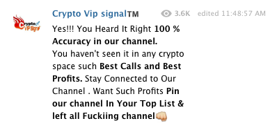 This is a group of channels in Telegram, which provides crypto signals. The admin of this channel claims they provide the best crypto signals and says the following words (I do not want to write them, I will just show you the screenshot):