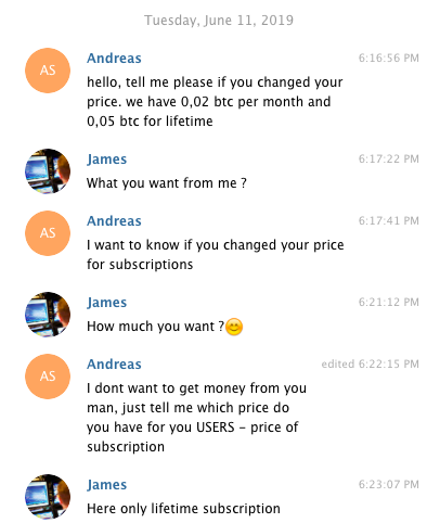 When we added this provider to our platform, he had 2 types of subscription - monthly for 0.02 BTC and lifetime for 0.05 BTC. Now he has ONLY lifetime one for 0.04 BTC. Don’t you think it’s strange? 0.04 BTC it’s approximately 310$ now. If we compare this price to our trusted providers’ prices, we will see they have such a price for 6 months at least, but not for a lifetime subscription. So this is a huge red flag of scamming. And, by the way, i will put a screenshot here for you to see his manner of chatting. How can this person consult someone, I am sorry?