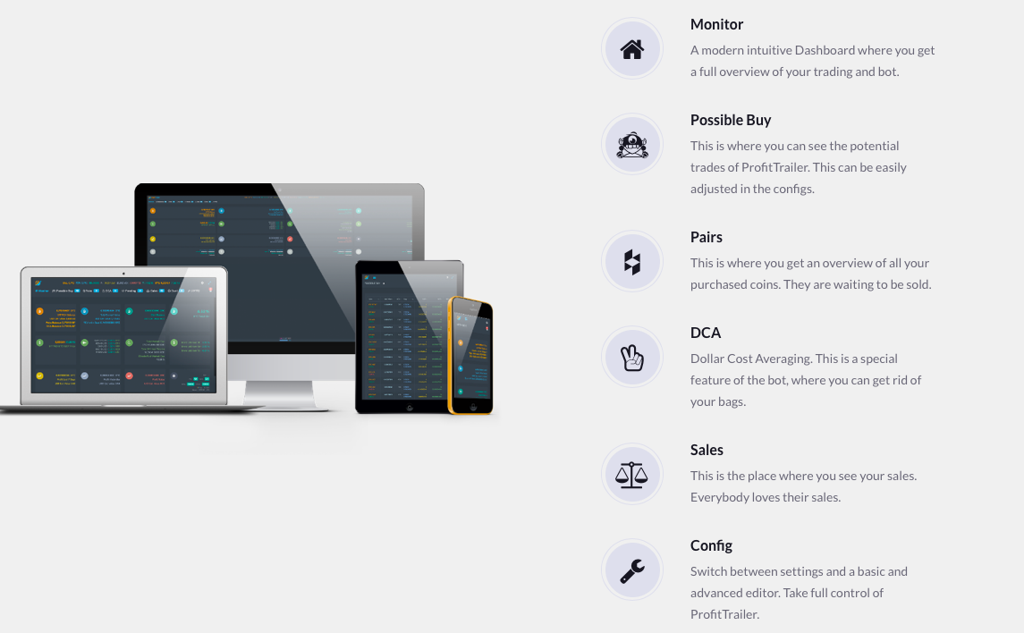 Let me start by telling you about this bot. First, it’s been around for a bit, since 2017. It is a powerful tool and a great player on the cryptocurrency market. This platform advertises 3 main advantages to its users. They include multiple trading strategies, a friendly community of traders and the possibility to trail crypto trends. On the website, traders can try out the live demo option. Since I’m not familiar with how that works, I can’t say for sure if it will help you or whether it’s going to waste your time. The creator and mastermind is Elroy, who has apparently built a good reputation using it. He regularly updates the platform, so from time to time, you’re going to run into new tweaks and features to add to your PT account. Enough about the surface details and back to what I was saying — what this crypto trading bot does for you. If not make trades for you, then at least it shows you how to. But saying it in this manner probably belittles the full range of its abilities. How do I know this? Guys! It’s been 3 months, and I’m going to be very honest with you: there’s rarely any crypto trading bot out there that is better than it. But don’t take my word for it, see for yourself. Follow me into the next section as I unravel ProfitTrailers’ trading weapons - its features. Take a look.