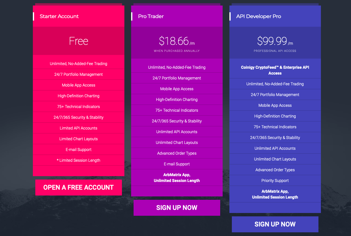 Check this out: contrary to similar crypto exchanges, there are no Coinigy fees or any other sort of trading fees. The way that it comes up with its revenue is by offering subscriptions. They also sell historical pricing data to software developers. New users will be able to use most of its features during the initial 30-day free trial. However, there are a few exceptions: only paid subscribers can access ArbMatrix.