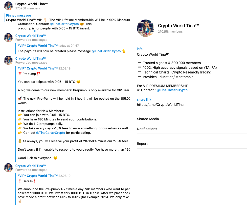 Today we want to show you some interesting info about Crypto World Tina Telegram channel. By the way, if you have already read our special audit about Trading Crypto Coach, you can continue reading, if no - check this page and get back to read this one.