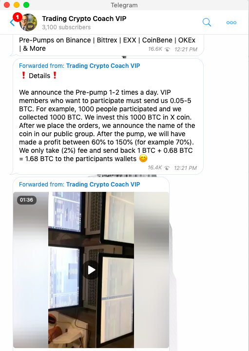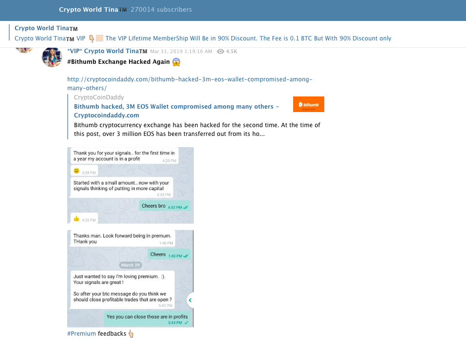 The last post in Tina Carter's chennal if for 22.03.2019. I decided to check if she has made something new. I found her new account in Telegram, wrote her a big message about her pre-pump strategy, about the same info as in Trading Crypto Coach, and she told me she is not a scammer - Trading Crypto Coach just copied her info. imagine someone copies your info - what will you do? Of course you will write in your channel "hey guys, he is a scammer, don't believe him! and s.o.", but in her channel - nothing.