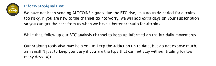 Without exaggeration, Infocrypto is a role model for other providers of cryptocalls. We have listed all the benefits they provide in our Infocrypto review. However, we noticed one strange thing that may become a problem for users who do not know Portuguese. Posts in this language pop up in the free Infocrypro Telegram channel from time to time. So, users who do not know Portuguese (and these users abound in the Infocrypto Telegram channel) will not be able to understand the information and decide whether it is useful for them or not.